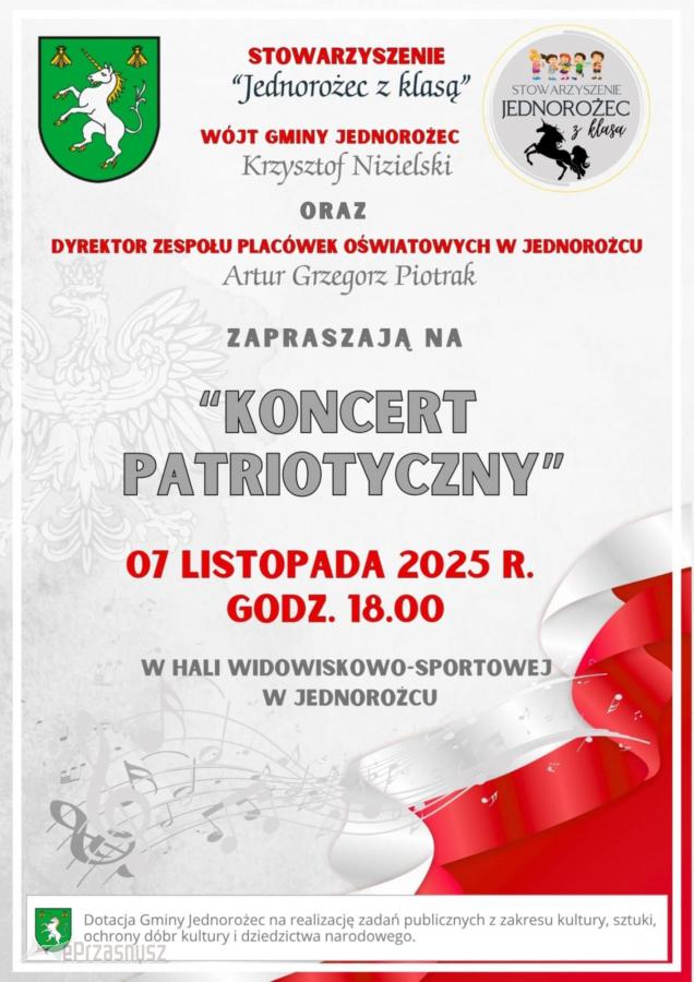Zapraszamy na niezapomniane wydarzenie - wspólne śpiewanie pieśni patriotycznych! 7 listopada 2025 r. o godzinie 17:00 w Hali Widowiskowo-Sportowej w Jednorożcu czeka nas wieczór pełen wzruszeń, refleksji i wspólnego śpiewu. Dołącz do nas i razem uczcijmy historię Polski poprzez muzykę.