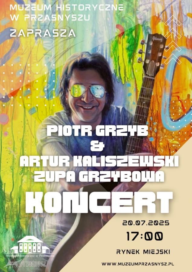Piotr Grzyb, muzyk o wyjątkowej barwie głosu, znany z pięciu płyt CD i trzech winyli. Wykonuje muzykę żeglarską i turystyczną, ubarwiając swoje koncerty poezją i rockowymi hitami. Zespół Zupa Grzybowa, którego jest liderem, cieszy się ogromną popularnością. Muzeum Historyczne w Przasnyszu zaprasza na koncert tego utalentowanego artysty!